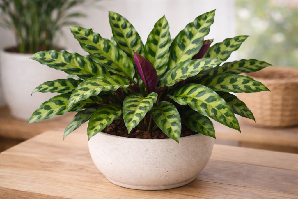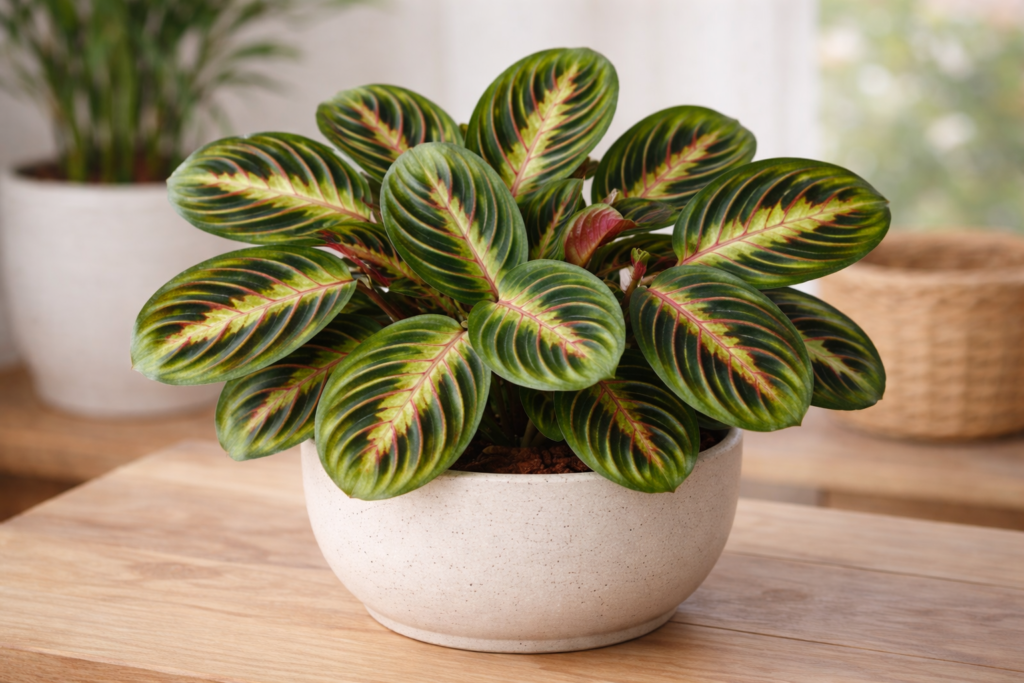 Diferentemente de plantas estáticas, a maranta reage à luz, criando movimento visual. Isso reforça a sensação de planta viva, não apenas decorativa.