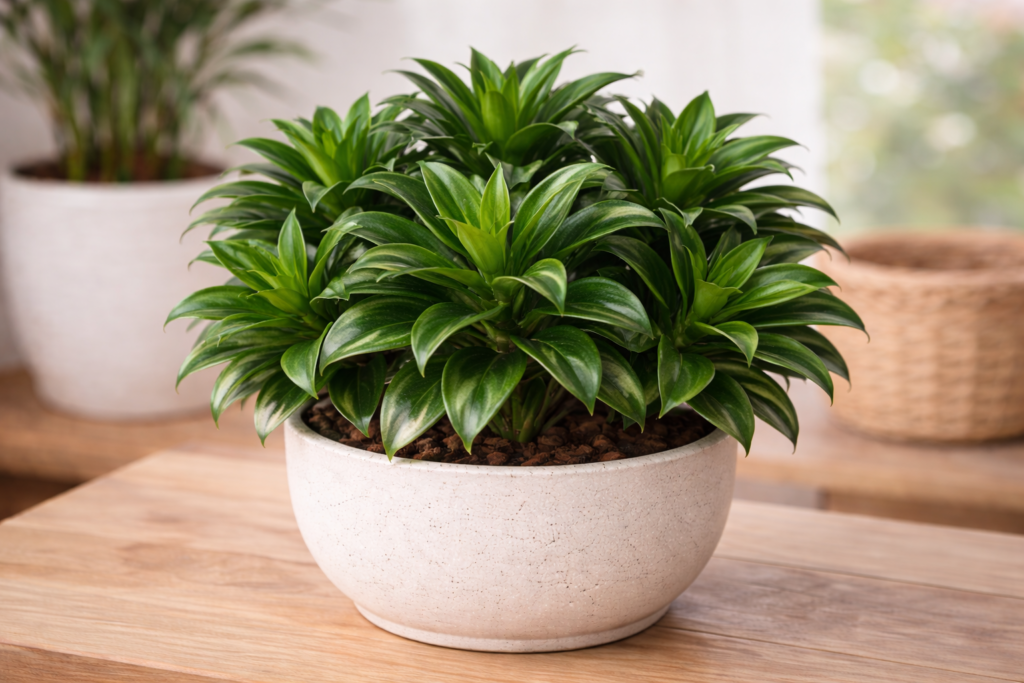 Por fim, uma escolha segura para salas e corredores. Seu crescimento lento e estrutura firme ajudam a manter o equilíbrio visual do ambiente.