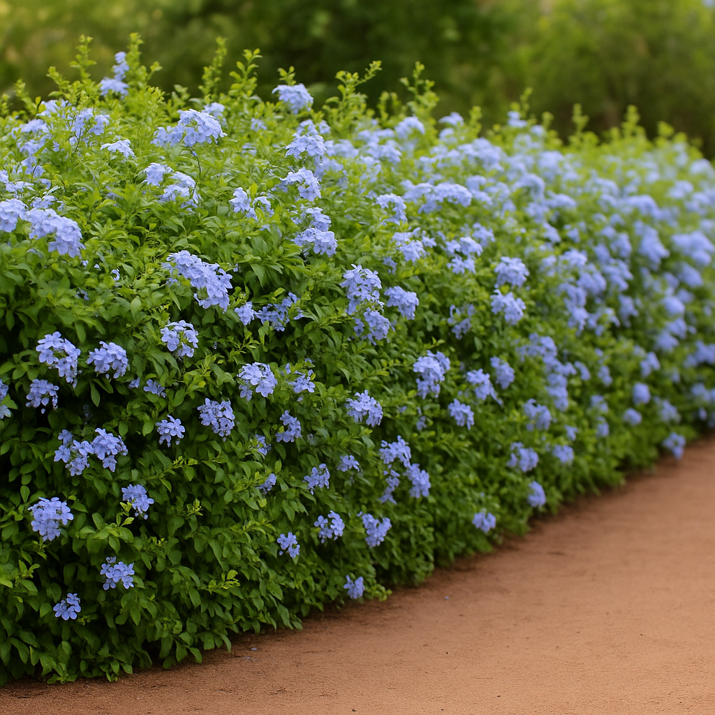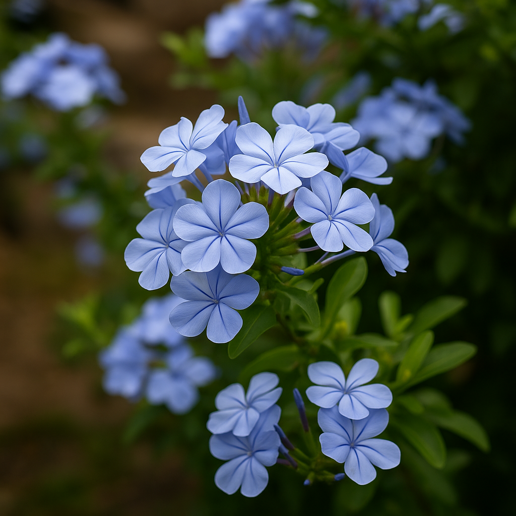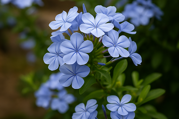 – Plumbago auriculata (azul-claro): a mais comum e cultivada, com tom suave e florescimento quase contínuo.