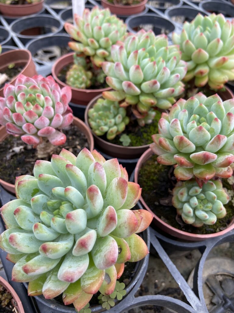 Cada uma apresenta pequenas diferenças na espessura das folhas e no tom da coloração. As híbridas com Echeveria tendem a ter folhas mais alongadas e coloração mais intensa, enquanto as com Sedum resultam em exemplares menores e mais compactos. Em coleções raras, há registros de mutações variegadas com listras prateadas, extremamente valorizadas no mercado.