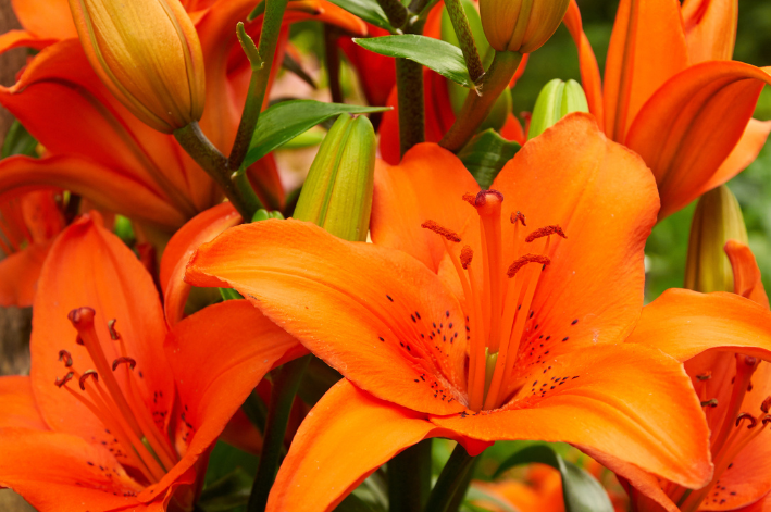 - Lilium tigrinum – o lírio-tigre, com pétalas laranjas e manchas escuras.