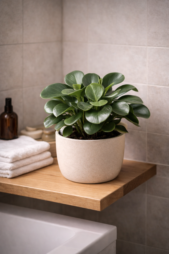 Pouco explorada em banheiros, a peperômia apresenta folhas espessas que toleram bem umidade ambiental. Prefere luz indireta e substrato levemente seco entre regas.