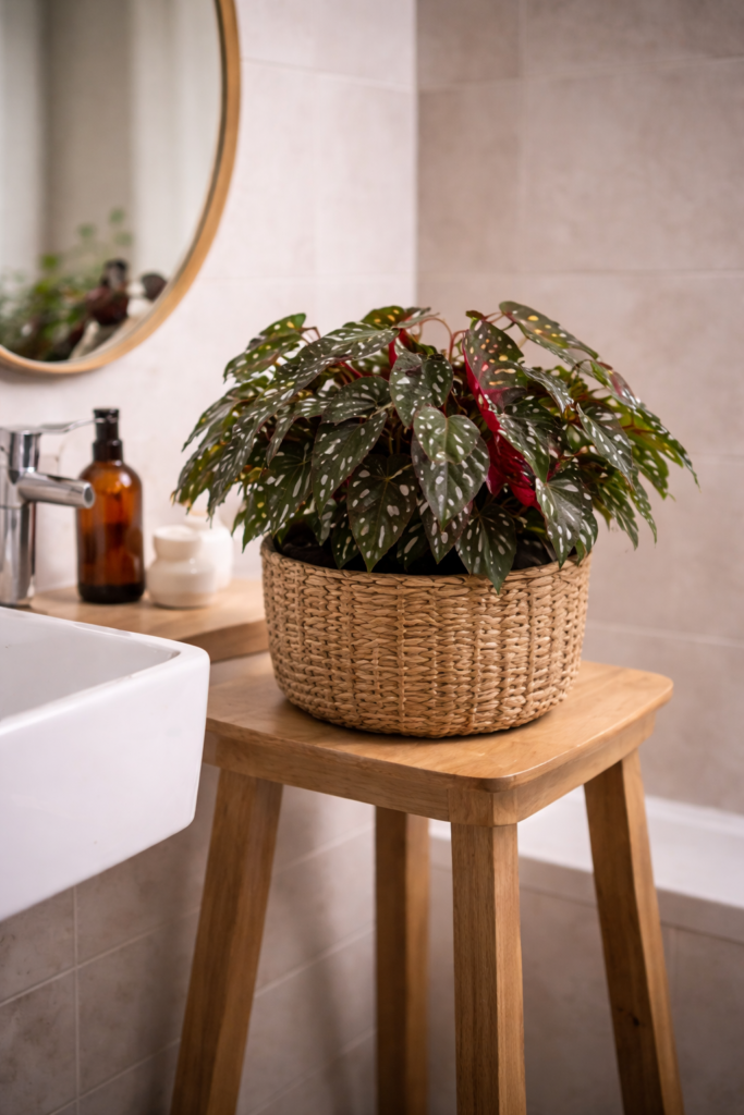 Begônia de folhas ornamentais que aprecia umidade do ar, mas exige boa drenagem. Funciona melhor em banheiros com luz filtrada.