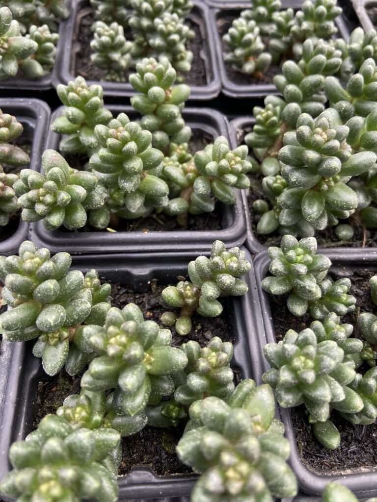 Os caules, com o passar dos anos, tornam-se lenhosos e firmes, criando uma aparência de mini-arbusto. Em vasos baixos ou suspensos, formam uma cascata densa e equilibrada, ideal para destacar o contraste com outras suculentas de folhas lisas e brilhantes.